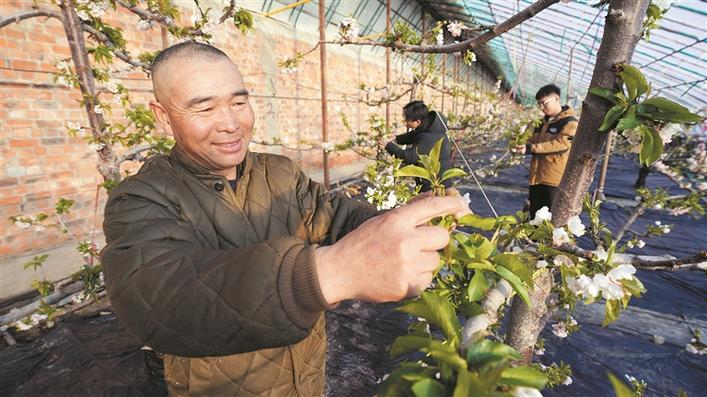 1月10日,在十师一八八团设施农业基地樱桃大棚内,种植户进行抹芽作业,以提升樱桃坐果率。眼下,一八八团设施农业基地25座大棚的樱桃树进入管护关键期,种植户们在技术人员的指导下忙着施肥、授粉,为樱桃丰产丰收打牢基础,大棚里一派繁忙景象。兵团日报常驻记者 李正虎 通讯员 叶思洋 摄