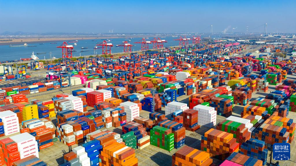 1月14日,运输车辆在江苏泰州港国际集装箱堆场转运集装箱(无人机照片)。