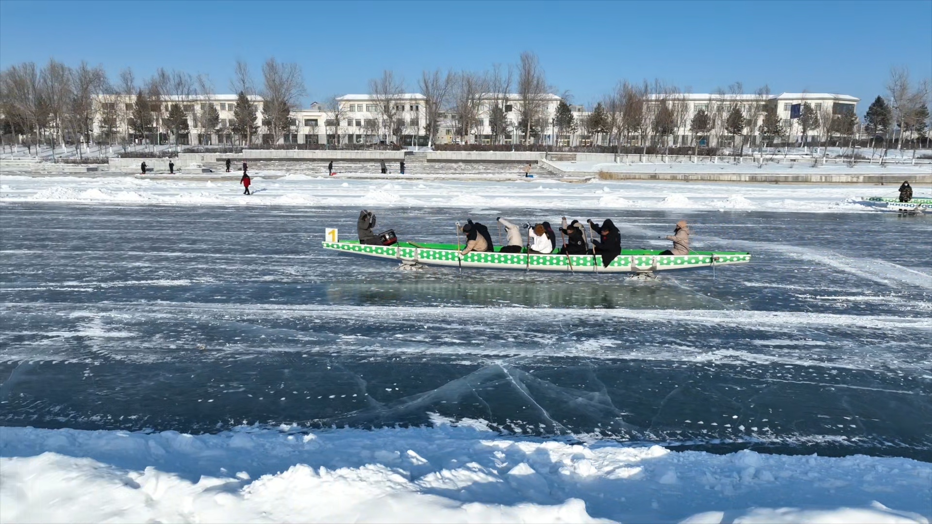 在冰封的玉带河上,参赛队伍合力划行,冰舟飞驰向前。