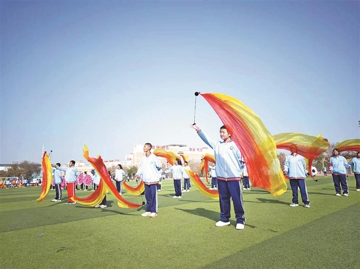 十二师三坪农场子女学校学生挥舞着红黄渐变的彩绸,进行一场活力满满的阳光体育赛事(资料图片)。兵团日报常驻记者 冯晓玲 摄