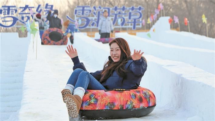 1月1日,六师芳草湖农场“冰雪奇缘 雪润芳草”冰雪旅游季启幕。图为游客乘坐雪圈从雪道飞驰而下。胡阿尼西·巴合提 摄