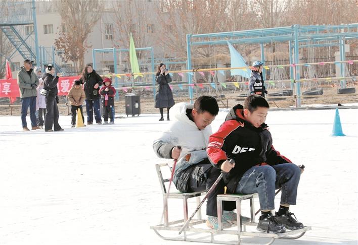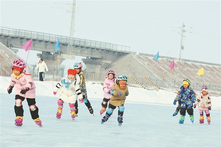 1月3日,孩子们在五师双河古道温泉冰雪运动场滑冰。岳佳豪 摄
