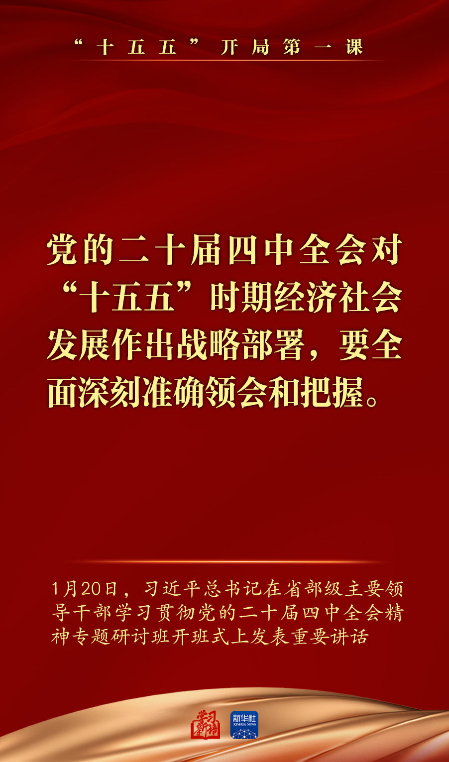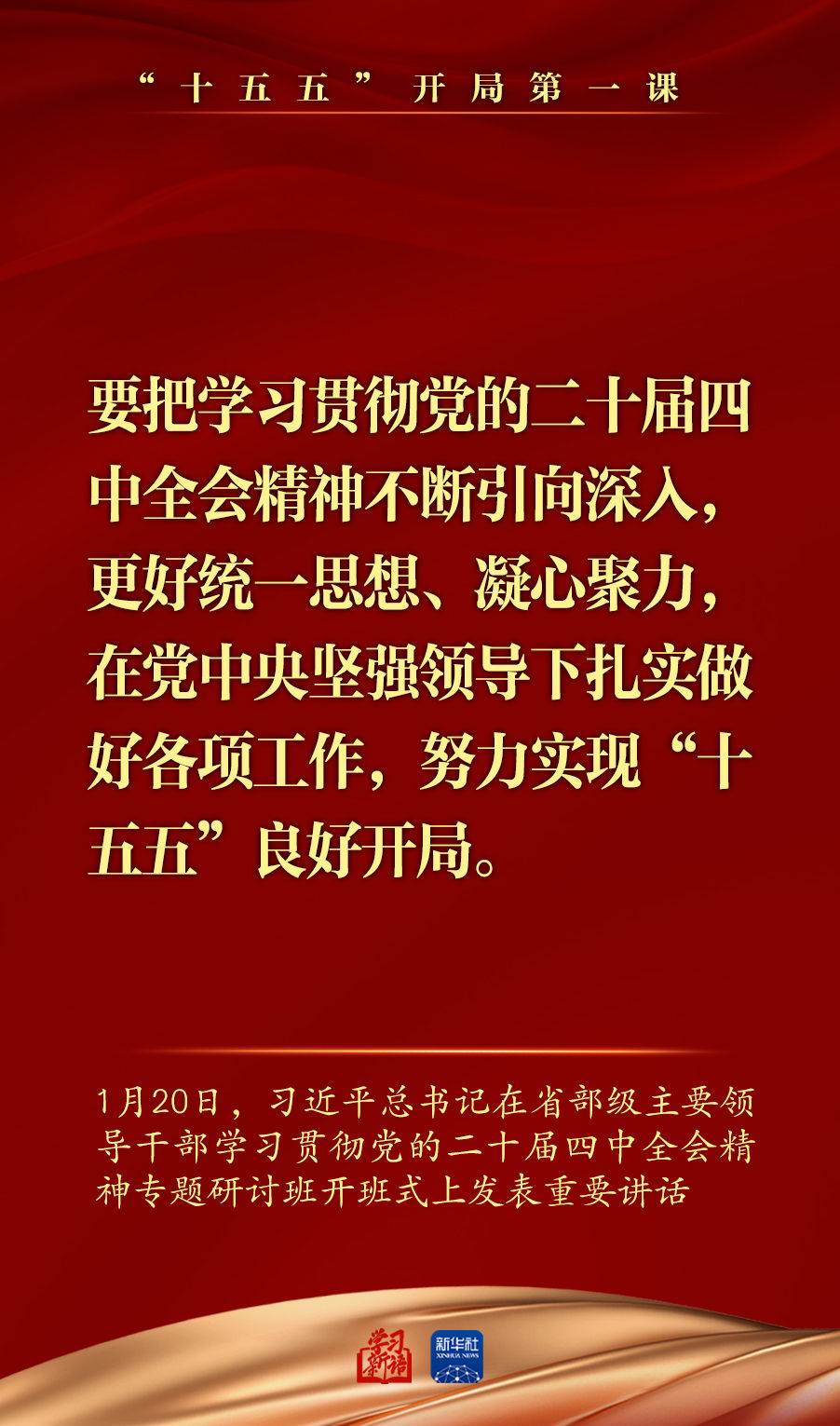 1月20日,省部级主要领导干部学习贯彻党的二十届四中全会精神专题研讨班在中央党校(国家行政学院)开班。习近平总书记在开班式上发表重要讲话强调,深入学习贯彻党的二十届四中全会精神,努力实现“十五五”良好开局。总书记讲话要点,一起学习领悟。