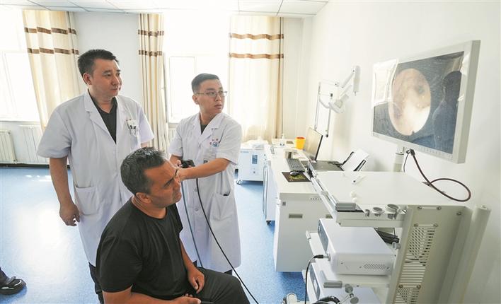 在十师北屯市总医院,黑龙江省援疆医疗专家崔忠涛(右)在耳鼻喉科为群众进行耳部检查(资料图片)。兵团日报常驻记者 李正虎 摄