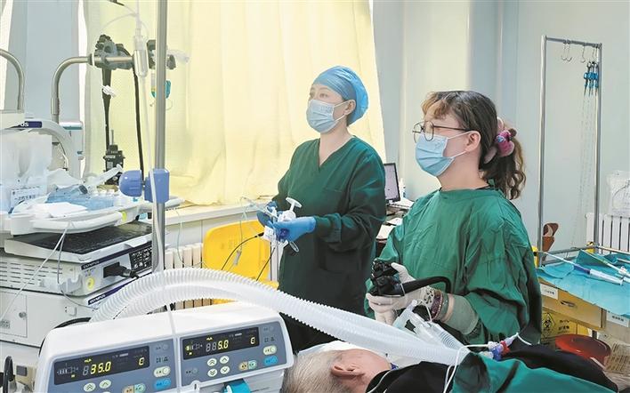 七师医院援疆专家、消化内科副主任许莹(右)带领徒弟顺利完成1例高难度胃早癌内镜下黏膜剥离手术(资料图片)。兵团卫健委 提供