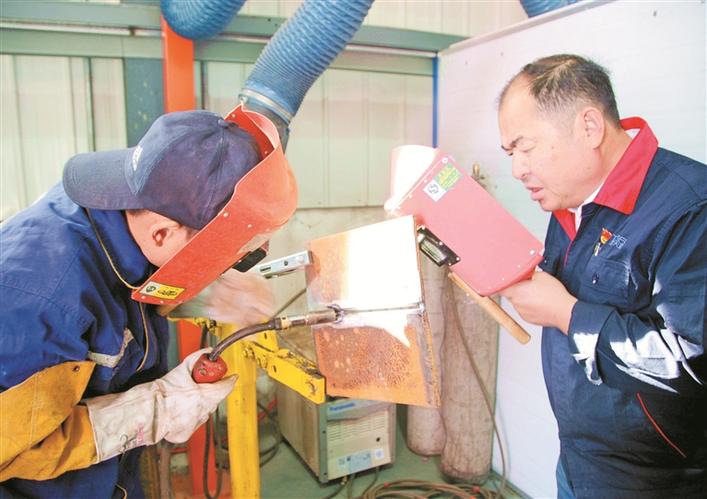 杨建立(右)指导学员进行焊接作业(资料图片)。图片由本人提供