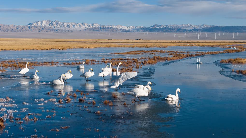 2025年11月14日,大天鹅在甘肃省阿克塞县小苏干湖湿地一处水域休憩、觅食(无人机照片)。新华社记者 郎兵兵 摄