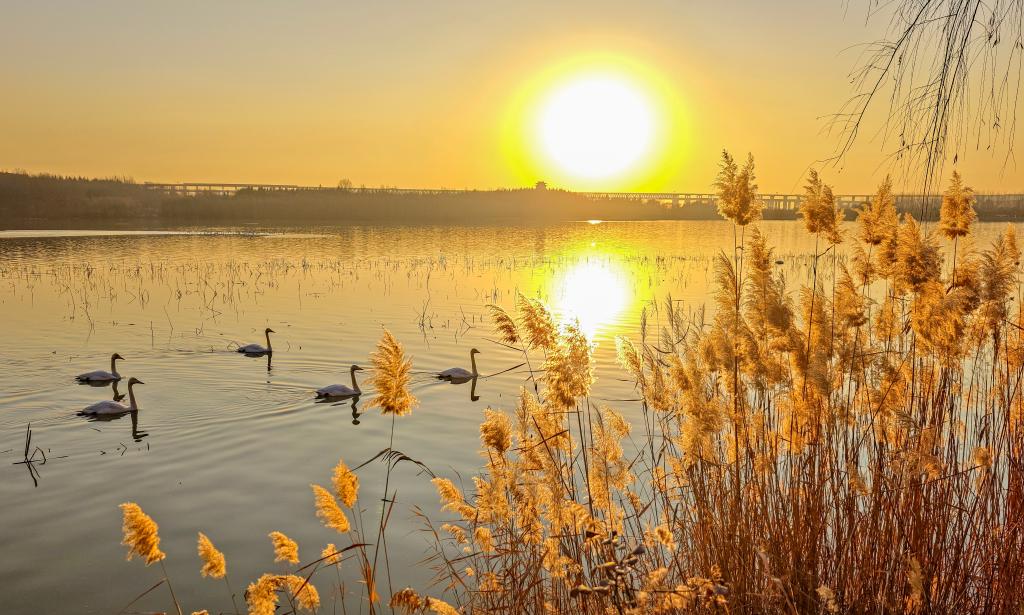 2024年12月28日,在河南省三门峡市天鹅湖国家城市湿地公园,几只天鹅在夕阳余晖下游动。新华社发(杜杰摄)