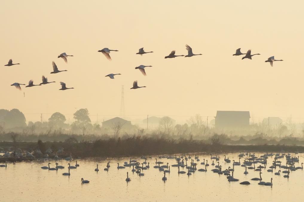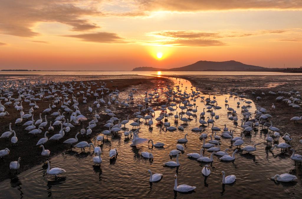 2024年12月20日,成群大天鹅在山东省荣成市天鹅湖湿地栖息。新华社发(李信君摄)