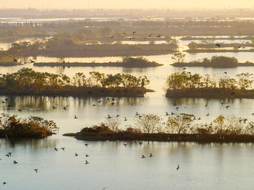 2024年11月23日,候鸟在江苏兴化里下河国家湿地公园内栖息、觅食(无人机照片)。新华社发(周社根 摄)
