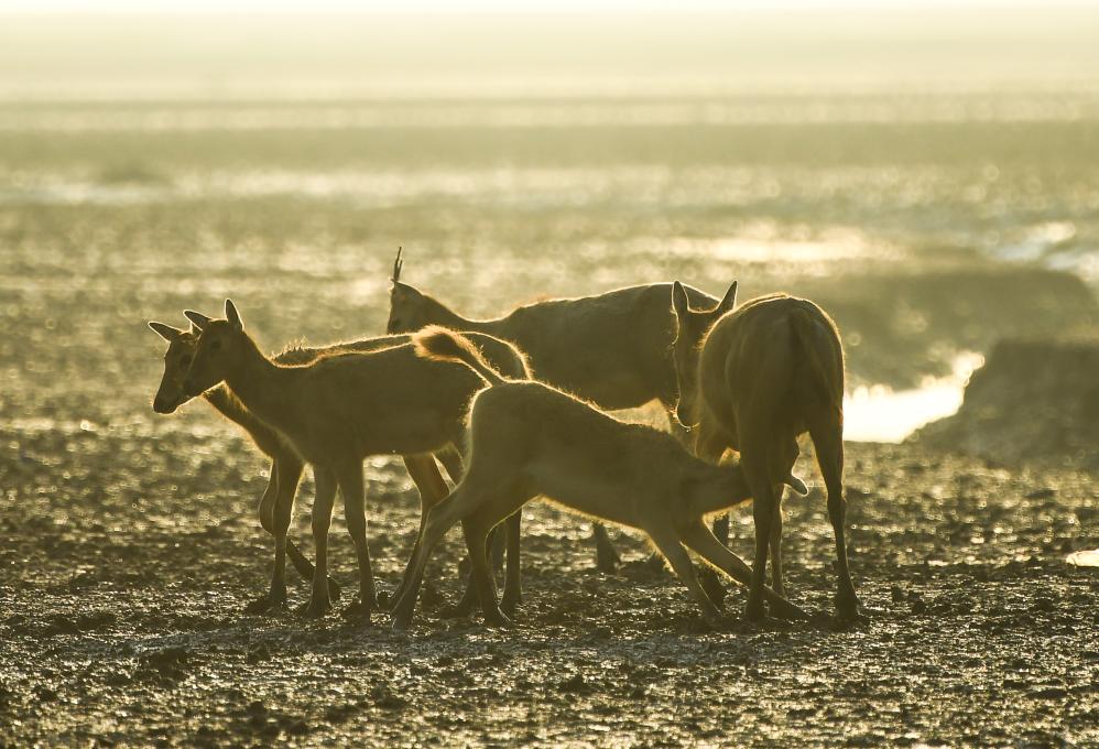 麋鹿生活在江苏大丰麋鹿国家级自然保护区(2023年8月21日摄,无人机照片)。新华社记者 季春鹏 摄
