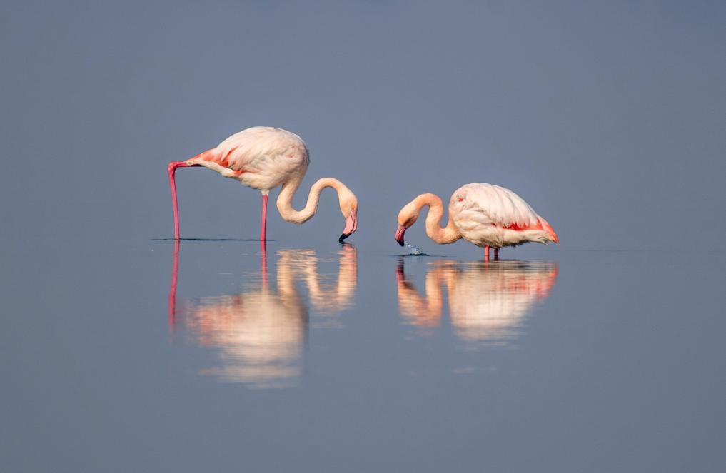 2025年1月1日在山西省运城市盐湖湿地拍摄的火烈鸟。新华社发(薛俊摄)
