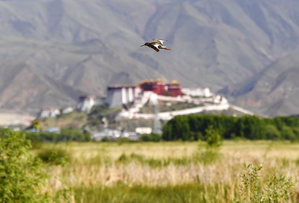 红脚鹬在拉鲁湿地上空盘旋(2023年6月23日摄)。新华社记者 张汝锋 摄