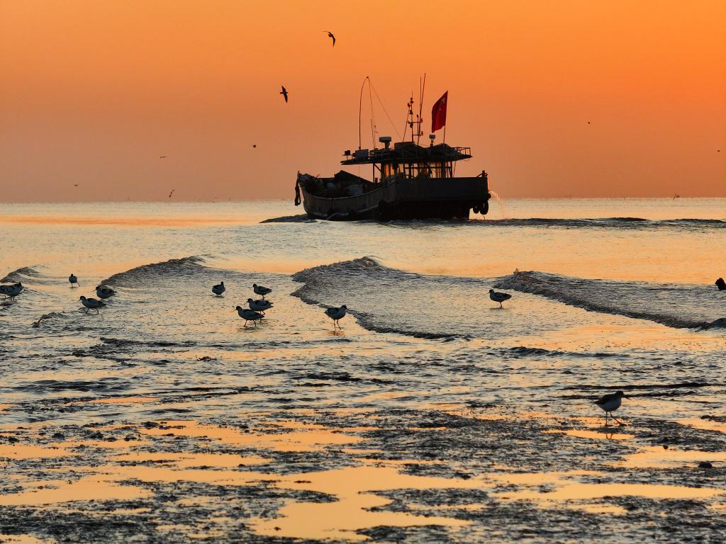 2025年11月19日,海鸟在江苏省连云港市赣榆区沿海湿地里觅食(无人机照片)。新华社发(司伟摄)