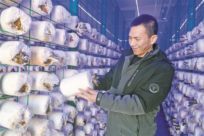 2月2日,商东升查看蘑菇长势。兵团日报常驻记者 李嘉成 摄