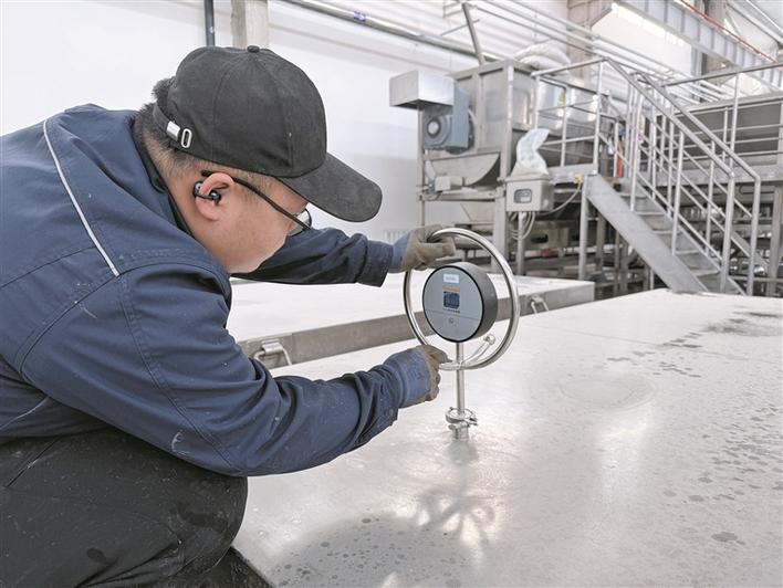 2月4日,七师一二九团新疆五五酒业有限公司生产车间内,工作人员正在全自动化酿酒车间仔细检查发酵窖池的温度。陈晓燕 摄