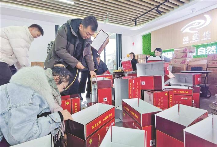 2月3日,新疆创锦供应链有限公司工作人员在四师可克达拉市农特产品展销中心装订礼盒,为订购货品的客户配货。兵团日报常驻记者 李惠 通讯员 张婷 摄