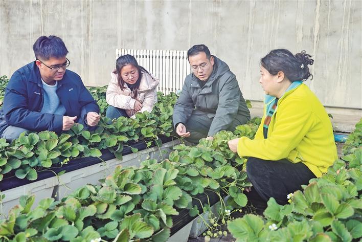 在二师二十九团园十一连的草莓大棚里,第25批博士服务团成员、二师农业科学研究所副所长蒋爽(右二)为职工讲解草莓种植技术(摄于1月8日)。兵团日报常驻记者 李嘉成 摄