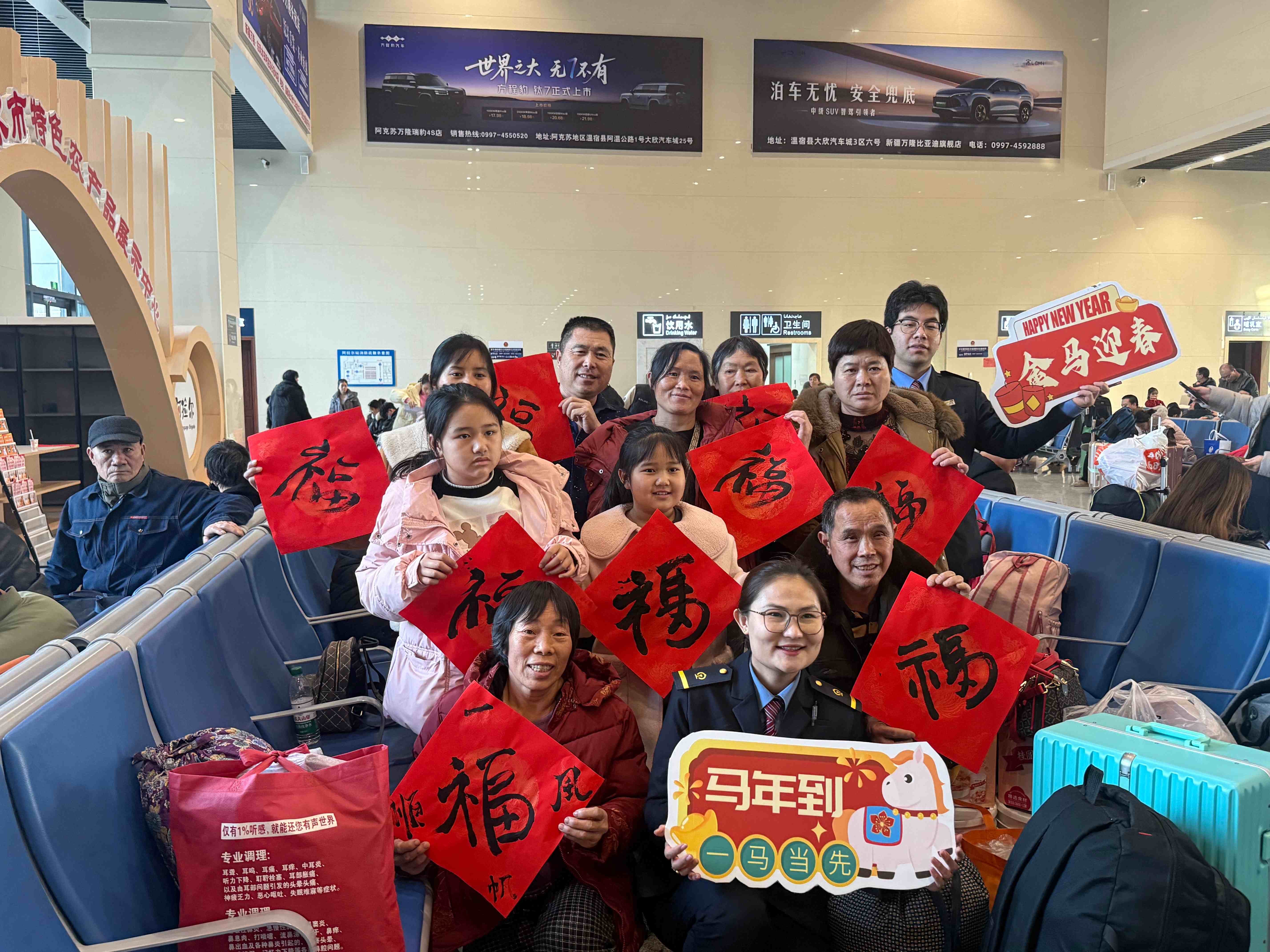 2月1日,阿拉尔火车站候车大厅内,客运人员和旅客展示“福”字。阿拉尔火车站供图