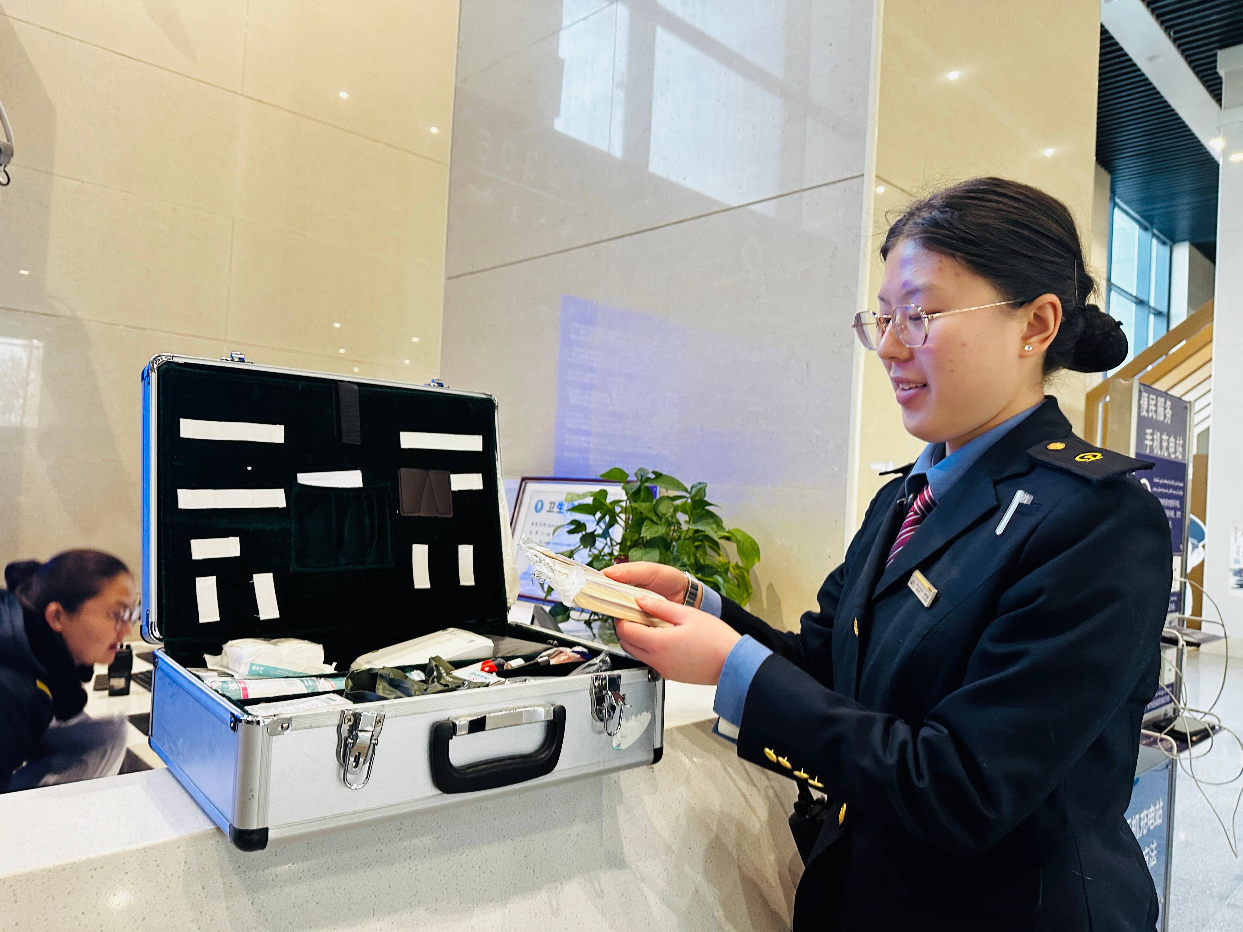 2月2日,阿拉尔火车站内,客运员谢雨蝶正在整理便民工具箱。李萍 摄