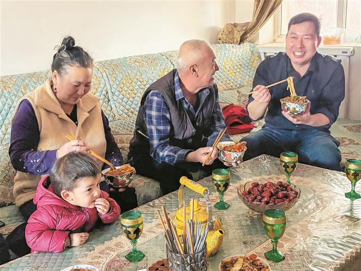 2月2日,刘春风(右)与买买提·吾司曼夫妻俩一起吃饭、唠家常。兵团日报全媒体记者 张美玲 常丫丫 赵宇 摄