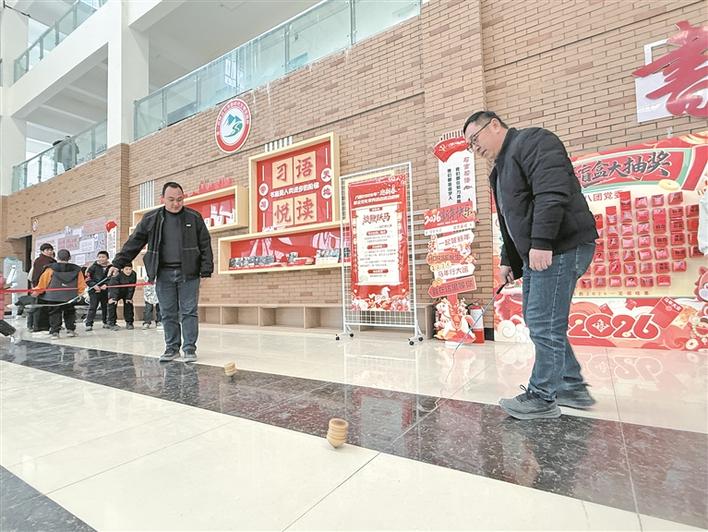 1月21日,一师八团开展迎春趣味活动。图为职工在抽陀螺。包伟 摄