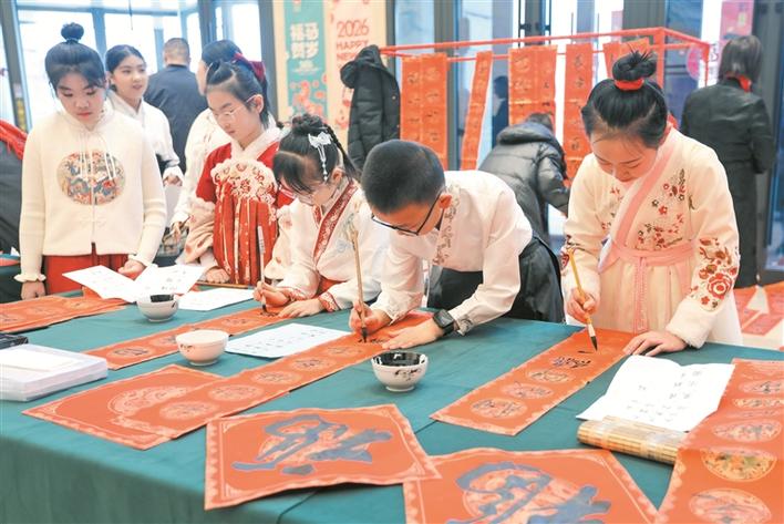 2月6日,2026年兵团“迎春送福”写春联、送春联、讲春联专场活动现场,“小小书法家”们挥毫书写春联。兵团日报全媒体记者 赵紫璇 摄