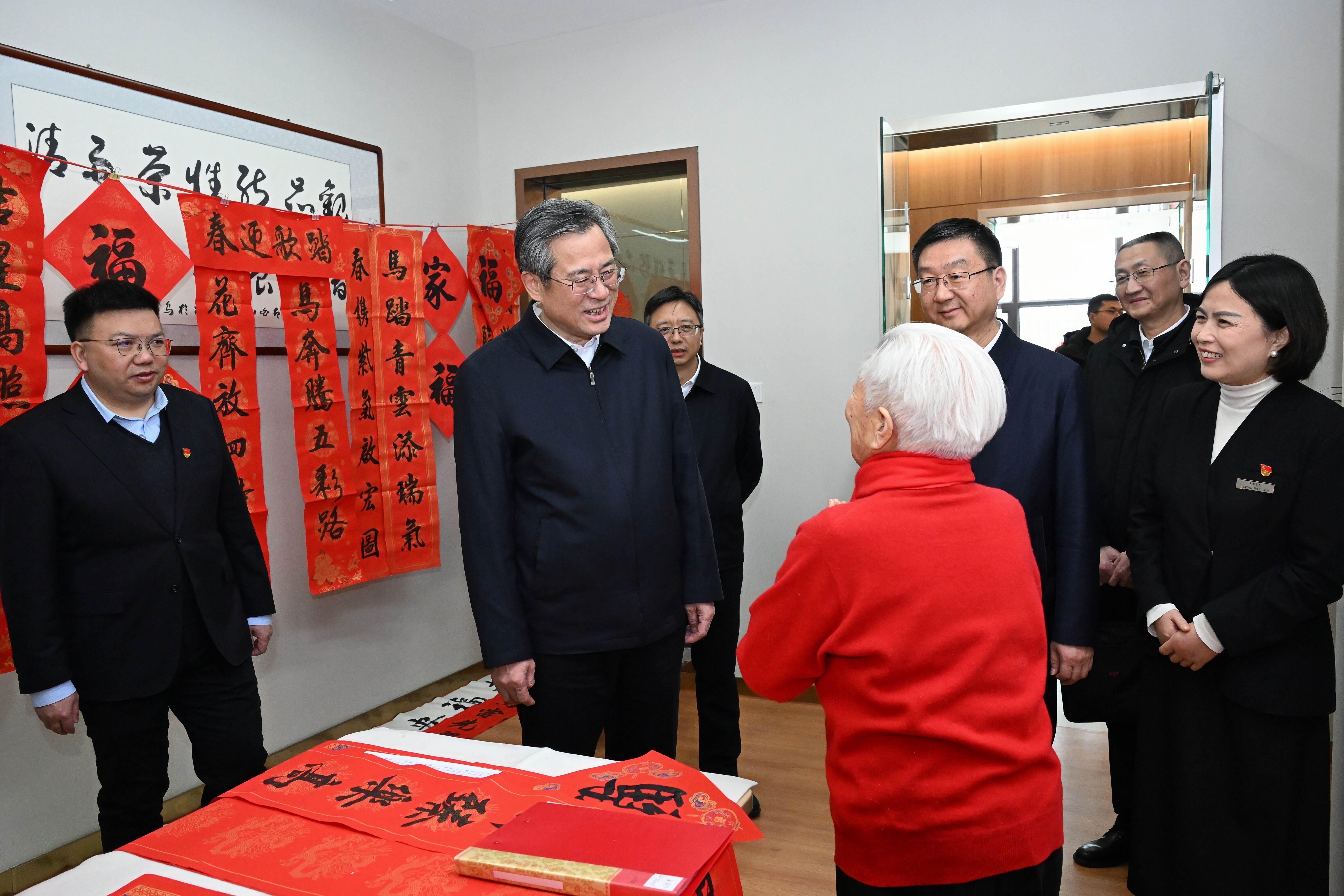 2月13日,自治区党委副书记、兵团党委书记、政委何忠友,自治区副主席、兵团党委副书记、司令员薛斌在兵团本级养老院,实地察看设施配备,与老人们亲切交谈。兵团日报全媒体记者 张鑫 摄