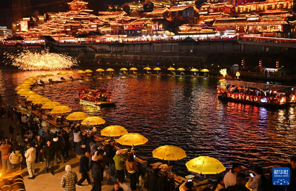 2月17日,游客在湖北省宣恩县城贡水河上观景游玩。新华社发(宋文 摄)
