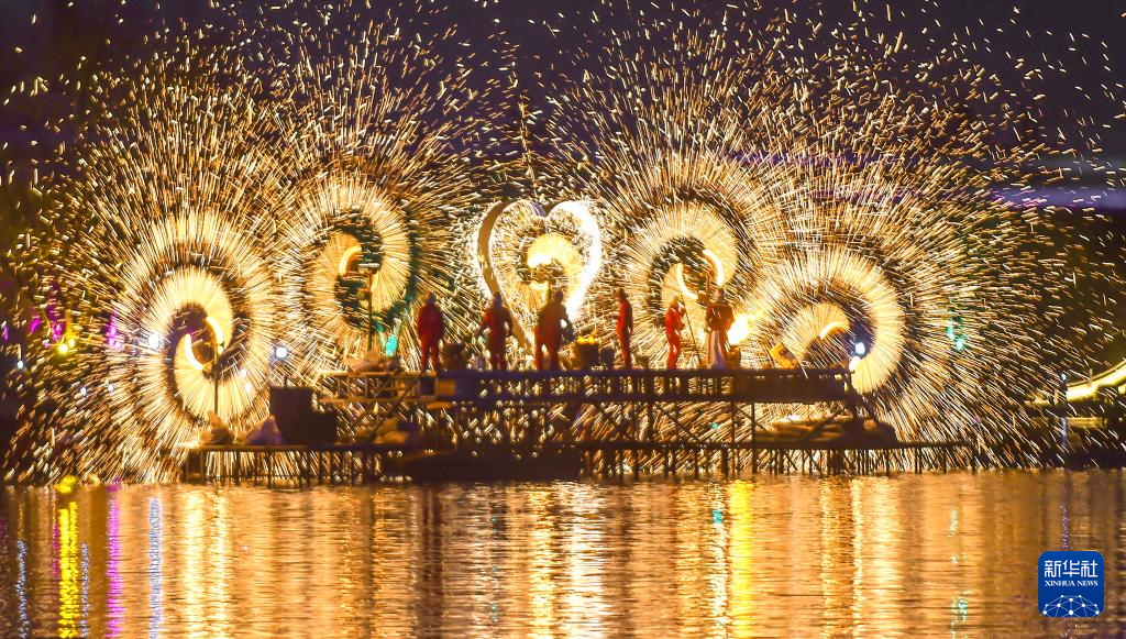 这是2月17日在河南省洛阳市隋唐城遗址植物园“神都上元灯会”上拍摄的水上打铁花表演。新华社发(黄政伟 摄)