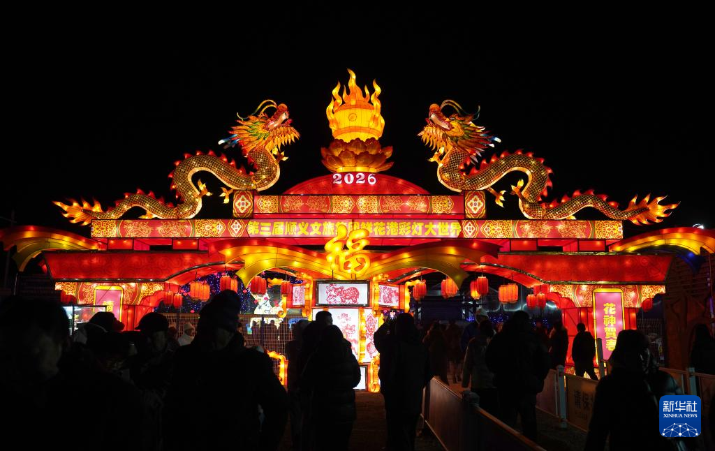 2月17日,游客在北京国际鲜花港彩灯大世界参观游览。新华社发(梁志强 摄)
