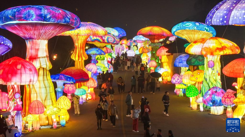 2月17日,游客在贵州省黔西南布依族苗族自治州兴义市阳光谷旅游度假区的灯会上游玩(无人机照片)。新华社发(刘朝富 摄)