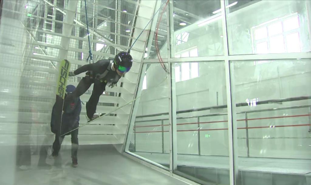 运动员在国家跳台滑雪训练科研基地的风洞实验室内训练。