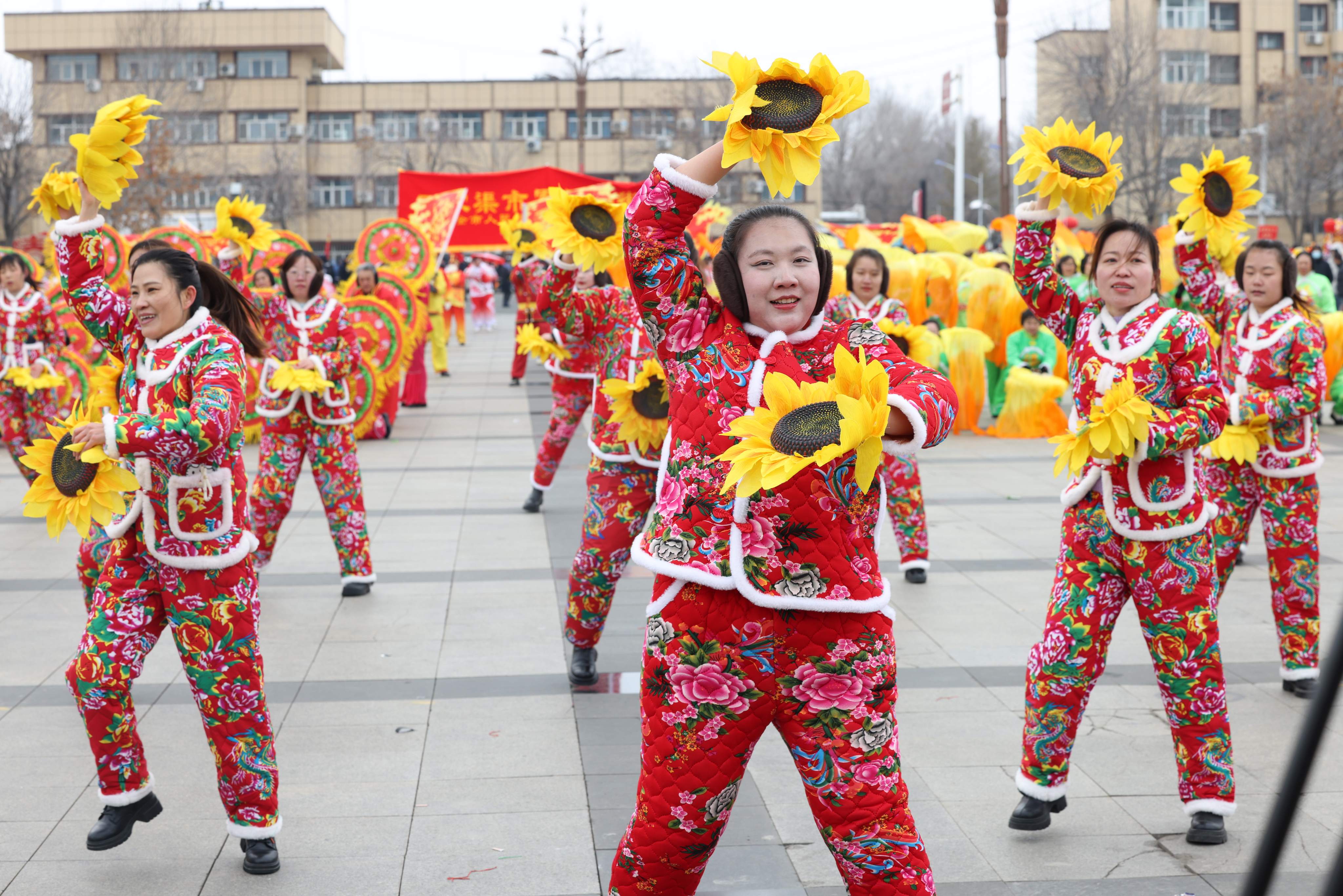 秧歌队步伐欢快,彩扇飞舞。