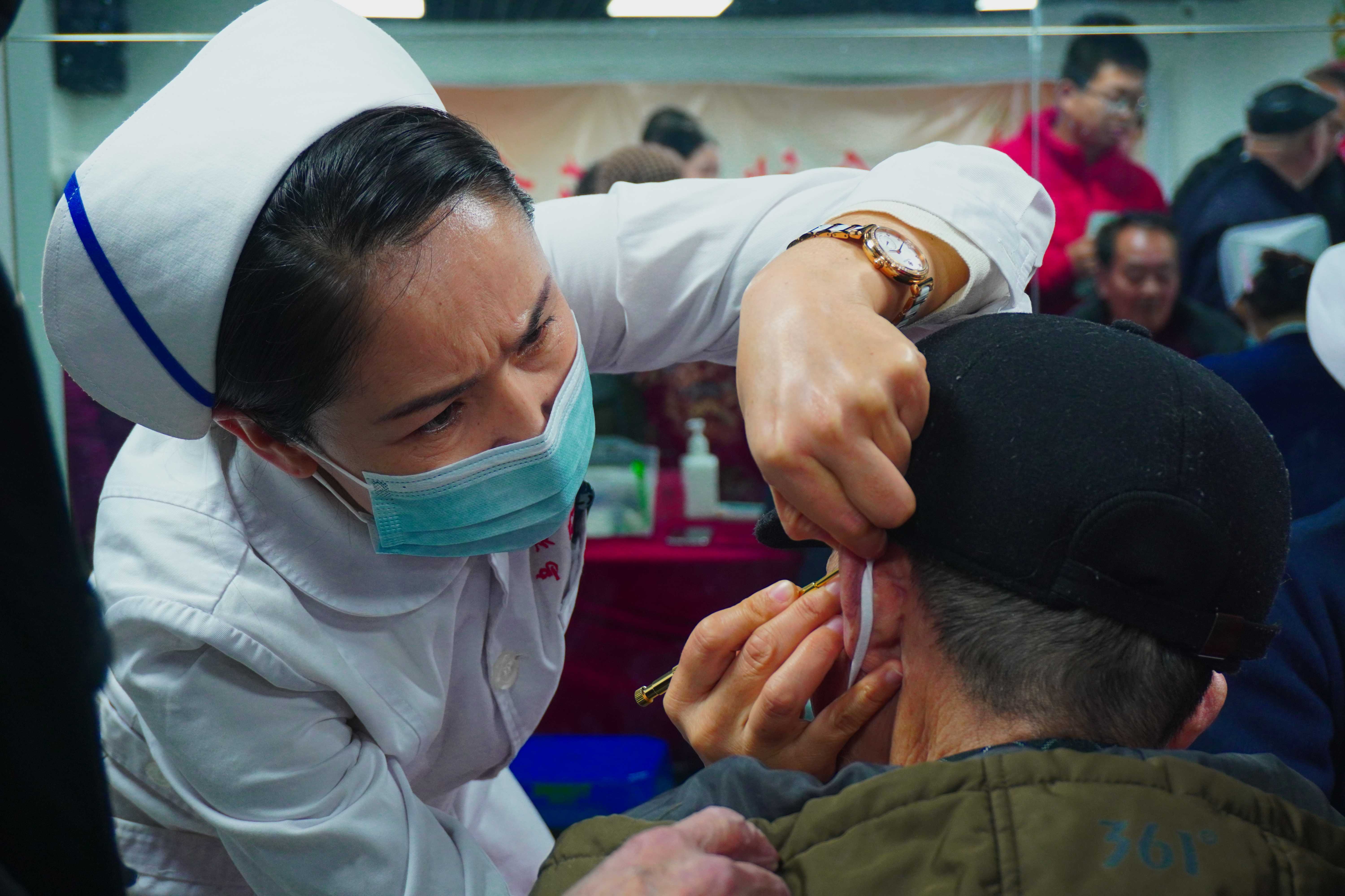 护士为前来义诊的居民进行耳穴贴压。胡杨网 唐媛媛 摄
