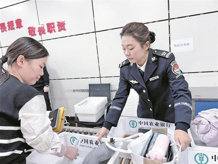 站在安检机输送带前,庞梦雪利落地推着装有旅客衣物、箱包的筐子,遇到包内有异物的旅客,她耐心地请旅客配合检查。