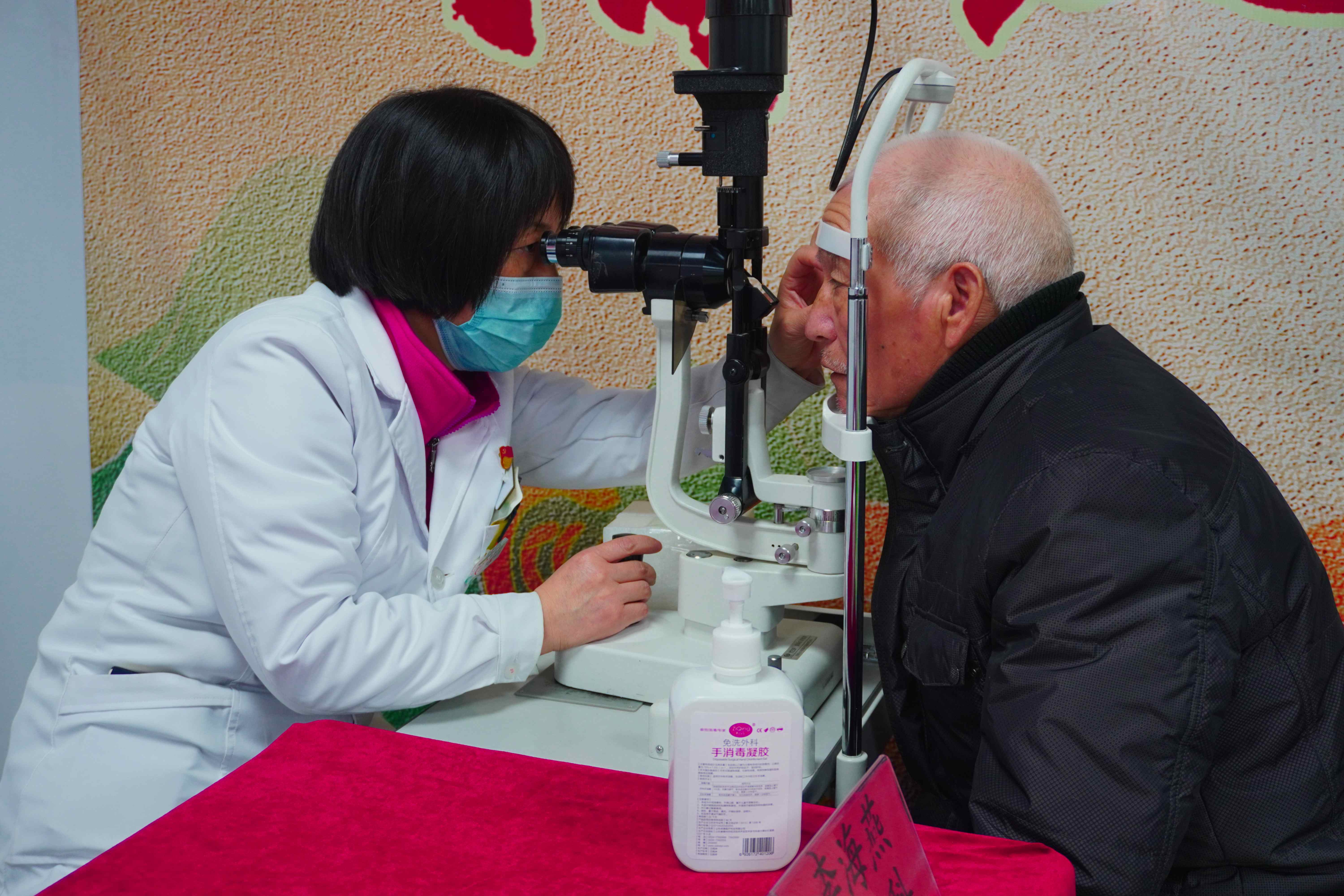 义诊现场,医生为辖区居民进行眼科检查。胡杨网 唐媛媛 摄