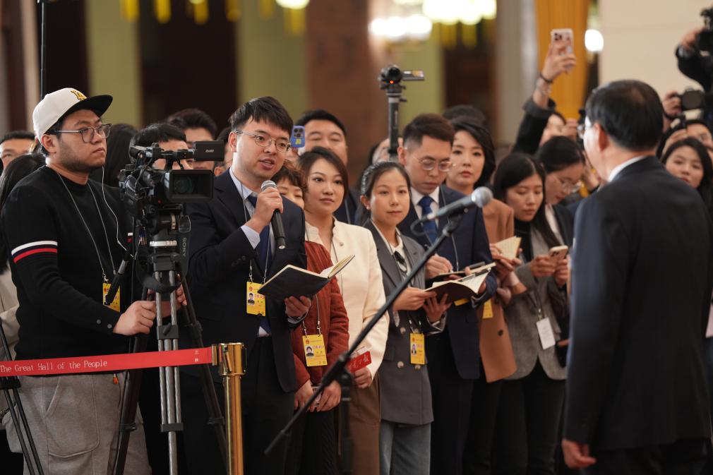 3月5日,第十四届全国人民代表大会第四次会议首场“部长通道”集中采访活动在北京人民大会堂举行。这是记者在现场提问。新华社记者 王曦 摄