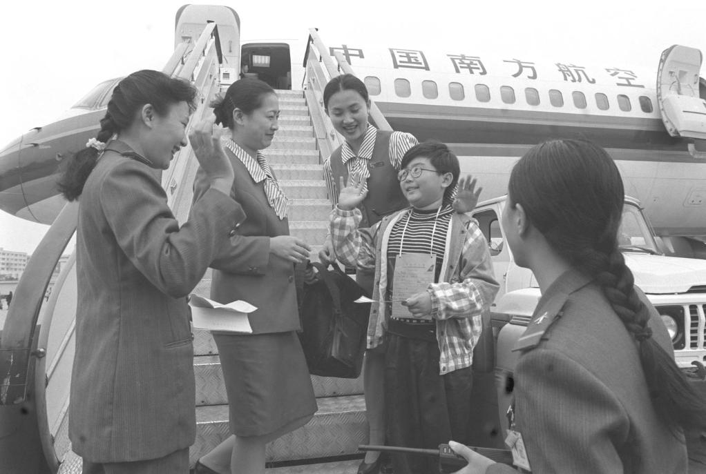 1996年2月1日,海口机场的工作人员将蔡晓畅小朋友交给中国南方航空公司海口至广州的3935次航班“托运”。蔡晓畅的父母因工作关系不能陪孩子回广州过春节,海口机场节日期间开办的“无人陪伴儿童”运送服务为他们解决了这一难题。新华社记者 陈小鹰 摄