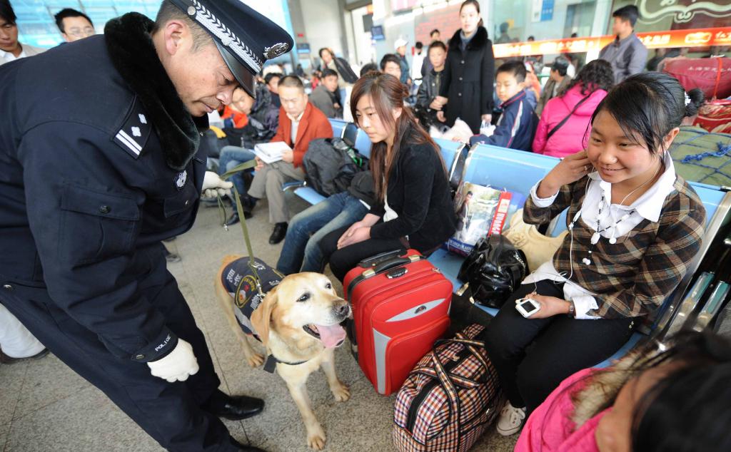 2009年1月17日,警犬“尼志”和训导员刘云飞在昆明火车站候车大厅巡逻。新华社记者 秦晴 摄