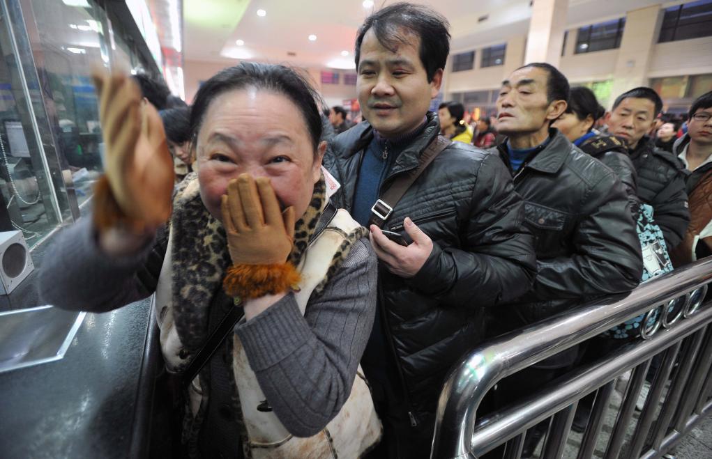 2013年1月29日,长沙火车站售票窗口前,工作人员告知一位女士当年2月14号长沙至广州的卧铺还有余票后,这位女士难掩喜悦。新华社记者 李尕 摄