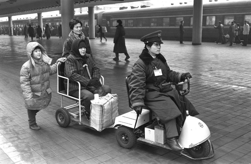 1994年1月30日,北京火车站客运员许新用电瓶车免费送旅客上车。新华社记者 唐召明 摄