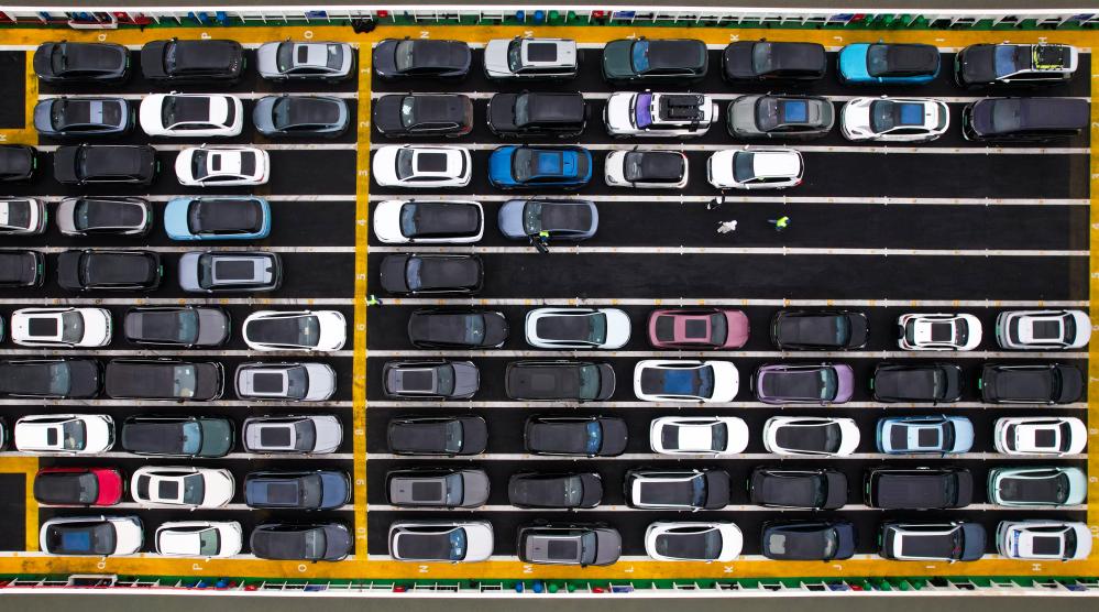2025年1月26日,在海南省海口市秀英港,车辆有序驶入新能源车专用运输船“绿源二号”准备过海。新华社记者 杨冠宇 摄