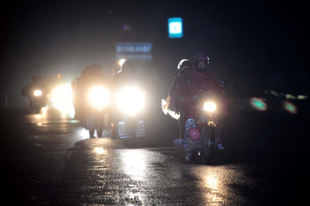 2011年1月19日,在210国道广西南丹县境内,春节前返乡的摩托车骑手在雨中赶路。新华社记者 黄孝邦 摄