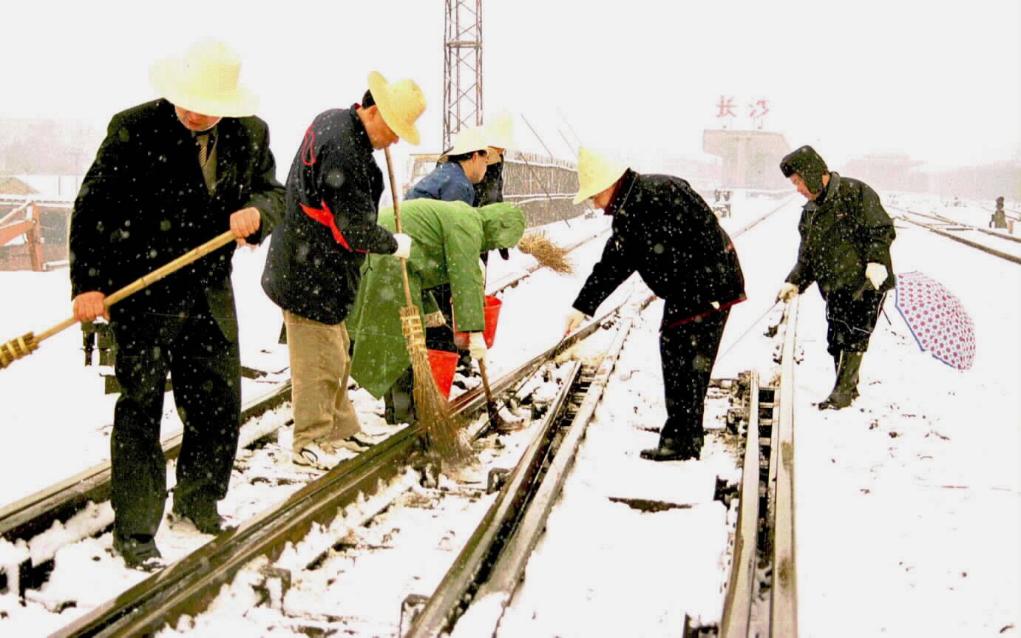 2000年1月31日,为确保春运安全,长沙火车站员工冒雪清扫路轨、检修岔道。新华社记者 龙弘涛 摄