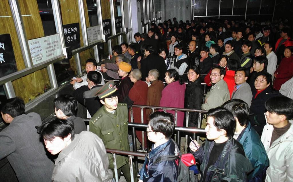 1993年1月12日,北京火车站开始进入春运高峰,旅客在排队进站。新华社记者 唐召明 摄