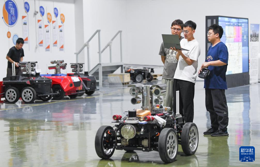 在位于重庆两江新区的七腾机器人有限公司重庆工厂,技术人员在调试防爆轮式机器人(2025年5月27日摄)。新华社记者 王全超 摄