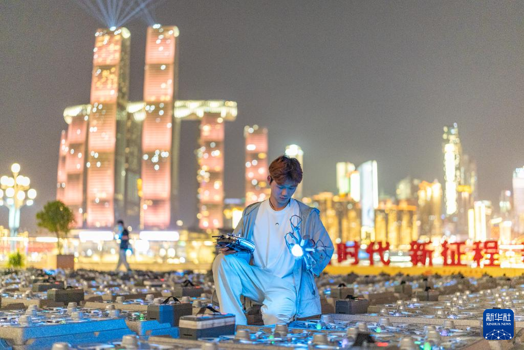 在重庆市南岸区,无人机群飞行规划员陆子祥在检查即将执行飞行表演的无人机状态(2025年5月1日摄)。新华社记者 黄伟 摄