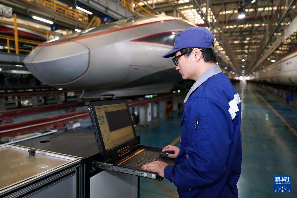 在上海动车段虹桥动车运用所,地勤机械师运用智能化轮辋轮辐超声波探伤机对动车组车轮进行超声波探伤(2026年2月28日)。新华社记者 王翔 摄