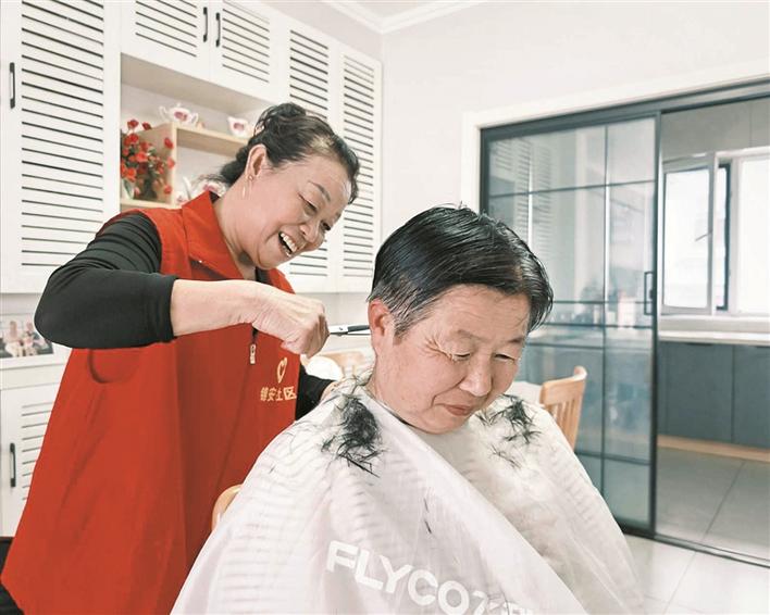 3月19日,四师可克达拉市花城街道锦安社区志愿者陈立清(后)入户为辖区老人开展义务理发志愿服务。目前,该社区已组建6支志愿服务队,近年累计开展各类志愿服务240余场,服务居民近万人次,用暖心服务践行雷锋精神。兵团日报常驻记者 杨俊钦 摄